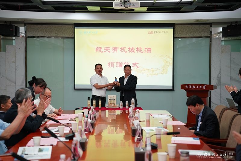 云南摩尔农庄常务副总经理段学荣(左)向油博馆馆长何东平(右)捐赠航天有机核桃油