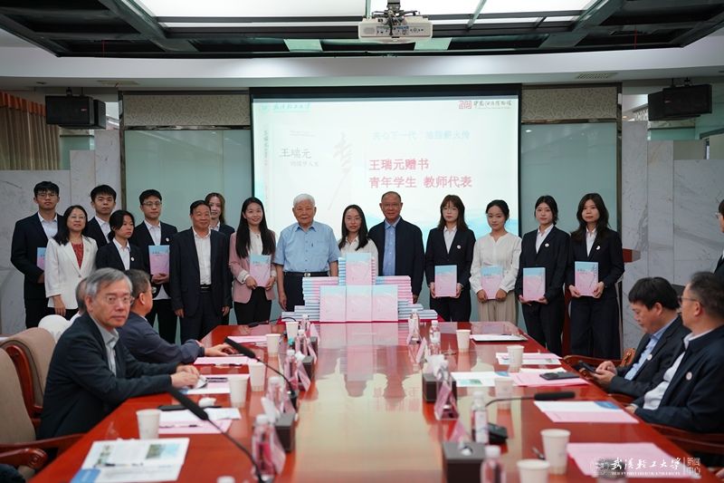 中国科协咨询决策首席专家、油脂博物馆终身名誉馆长、教授级高工王瑞元(右七)与学校关心下一代工作委员会常务副主任刘丰林(右五)等向青年学生、教师代表赠书