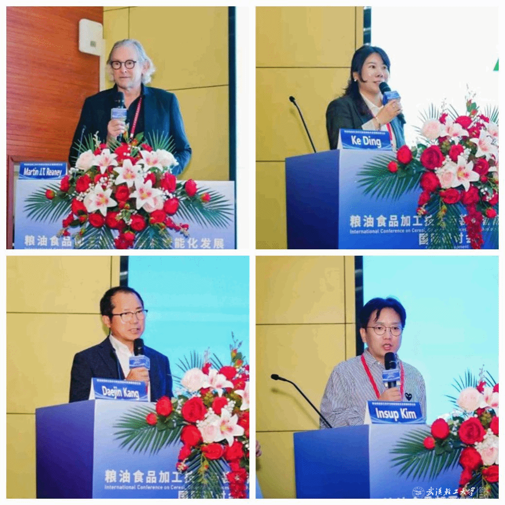 从上到下,从左到右依次为:加拿大萨斯喀彻温大学Martin J.T. Reaney教授、Ke Ding研究员,韩国大学Daejin Kang教授,韩国SEOBI公司CEO Insup Kim作报告
