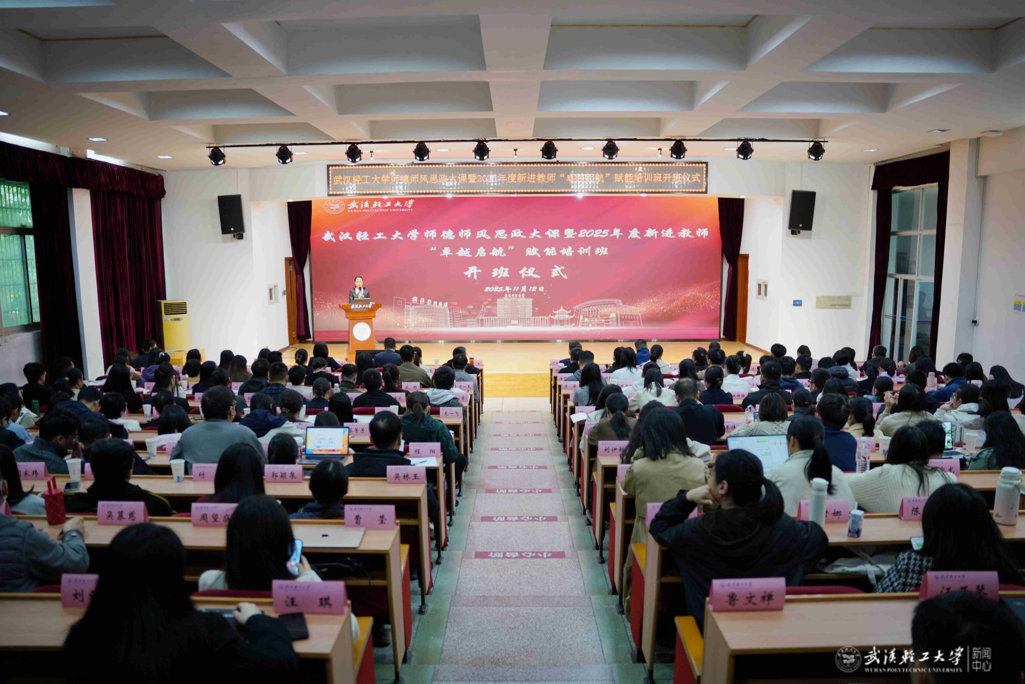 本网讯 11月12日,武汉轻工大学2025年度新进教师“卓越启航”赋能培训班开班仪式在常青校区科学报告厅举行。校党委书记严冀钢以“言为士则 行为世范 做学生为学、为事、为人的大先生”为题讲授开班第一课。活动由校党委副书记、副校长金艳主持。