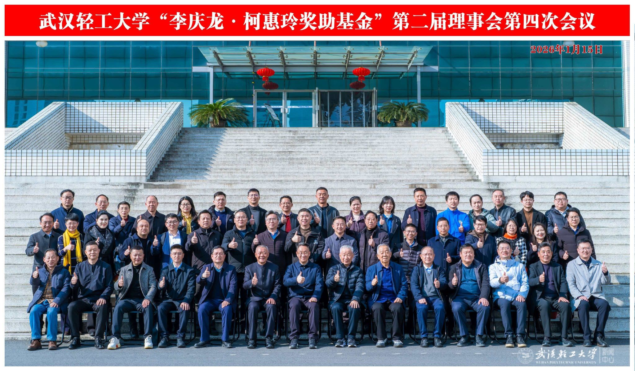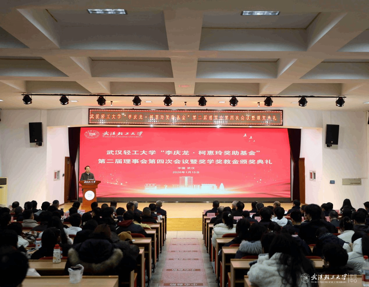 本网讯 2026年1月15日,武汉轻工大学“李庆龙・柯惠玲奖助基金”(以下简称“基金”)第二届理事会第四次会议暨颁奖大会,在我校常青校区科学报告厅隆重举行。校党委书记严冀钢,校党委常委、副校长曾山,基金发起人李庆龙教授,学校关心下一代工作委员会常务副主任、校友总会总顾问刘丰林教授,基金第二届理事会理事长、湖南麻辣王子食品有限公司董事长张玉东,内蒙古恒丰食品工业(集团)股份有限公司董事长魏建功等领导、嘉宾出席会议。会议由基金会秘书长、科技成果转化中心主任王学东教授主持。