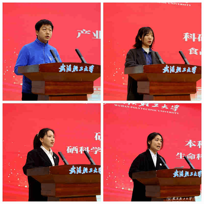 科研型教师代表、食品学院郭丹郡,产业型教师代表、机械学院李彬,研究生代表、硒产业学院岳明玮,本科生代表、生科学院皮诗宇分别发言。他们结合科研实践与学习经历,分享了获奖感悟,表达了以不懈奋斗助力学校发展的信心与决心。