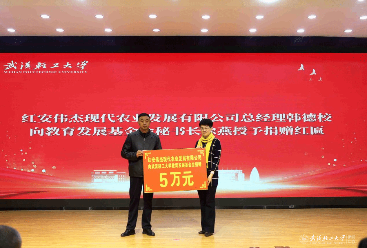 活动现场还举行了捐赠仪式,湖北宏信食品股份有限公司董事长刘亚东、红安伟杰现代农业发展有限公司总经理韩德校,分别向学校教育发展基金会秘书长徐燕授予捐赠红匾,彰显了企业心系教育、助力人才培养的社会责任。
