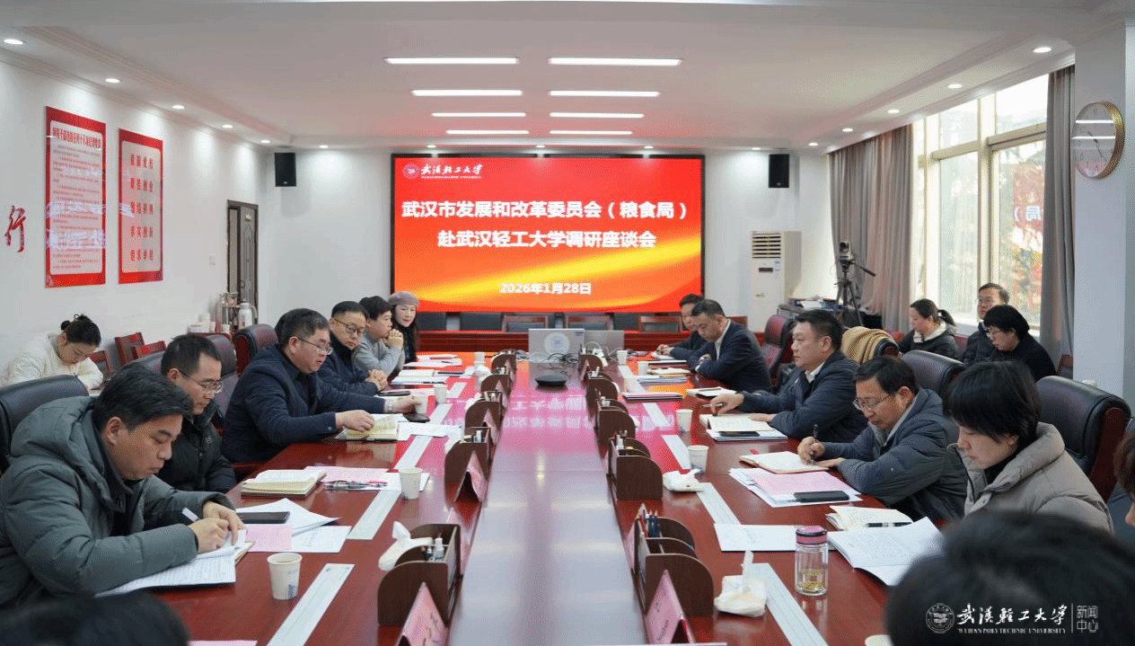 本网讯 2026年1月28日上午,武汉市发改委(粮食局)二级巡视员张文胜一行来校调研指导工作,洽谈战略合作。校长汪海波主持座谈会。相关职能部门、学院负责人参加座谈。