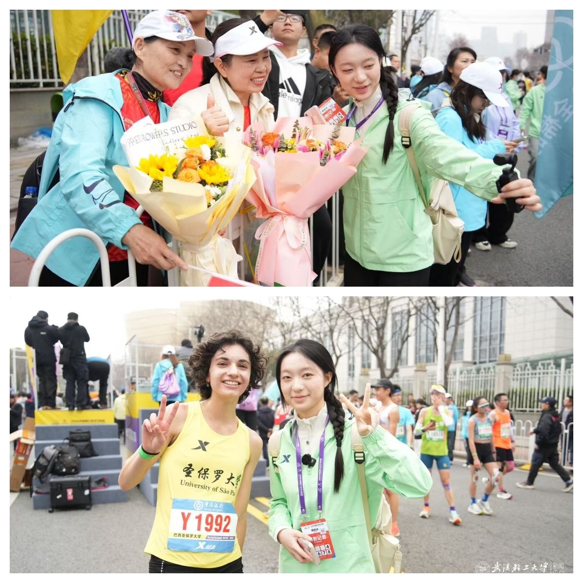 比赛当天,赛道内外节奏紧张、信息密集。赵明远与团队分工协作,除完成名校挑战赛相关报道外,还先后采访了俄罗斯驻武汉总领事及来自美国、英国、赞比亚、韩国、日本等50余名外籍跑者。她用专业的提问、真诚的交流,向世界讲述汉马故事,更展现出轻工大青年自信从容、务实担当的良好形象。