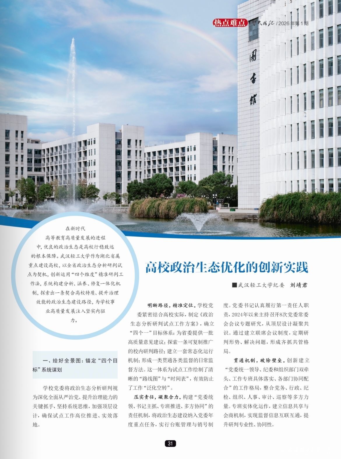 《楚天风纪》2026年第1期发表驻校纪检监察组组长、校纪委书记刘靖君文章《高校政治生态优化的创新实践》,介绍学校政治生态建设工作经验。