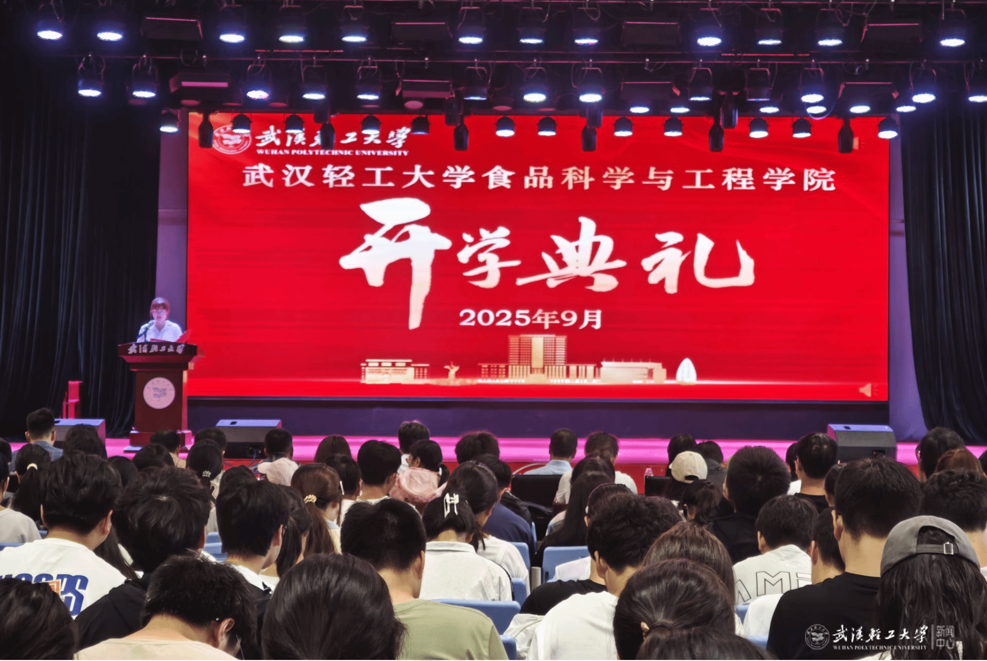 本网讯 9月25日,食品学院2025级新生开学典礼暨入学教育大会在金银湖校区大学生活动中心举行。学院领导班子成员、各系主任、新生班主任、辅导员与592名新生齐聚一堂,共同开启这场承载期待与梦想的青春启航之约。