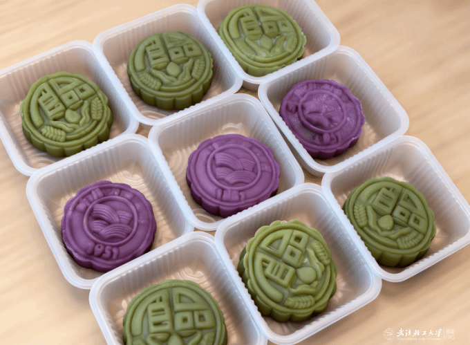 据悉,此次月饼制作全程由学院大一、大二学生组成的志愿团队参与,一枚枚精致月饼的诞生,离不开他们的用心打磨。而月饼的设计更融入多重文化与专业元素,兼具美观与深意:其中紫色月饼印有校徽,将“波浪形书本”与“工”字图案相结合,“波浪形书本”象征浩瀚的知识海洋,“工”字则呼应学校“轻工”办学特色,寄托着对2025级学子“以‘工’为基、以学为帆,深耕专业领域”的期许;绿色月饼则印有食品学院院徽,水滴与麦穗的图案直观展现粮油食品学科的专业底蕴,既传递“民以食为天”的行业初心,也鼓励新生未来投身食品事业,贡献青春力量。