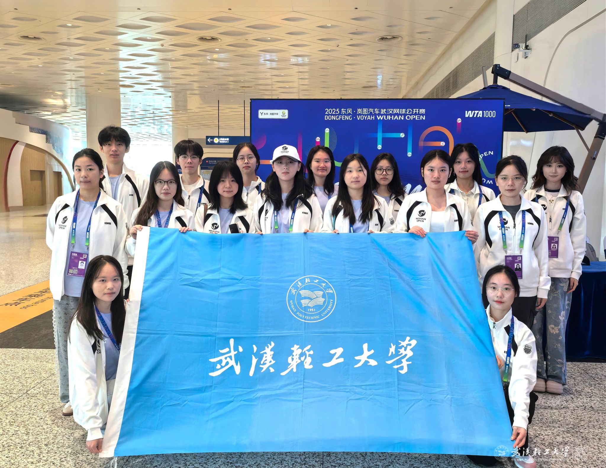 本网讯 金秋十月,星光汇聚江城,2025武汉网球公开赛(以下简称“武网”)如期启幕。我校精心选派20名学生志愿者,化身“机场接待助理”,驻守赛事服务前沿,以专业的服务、饱满的热情和温暖的态度,圆满完成了为期九天的抵离港接待任务,成为武网赛场外一道亮丽的青春风景线。