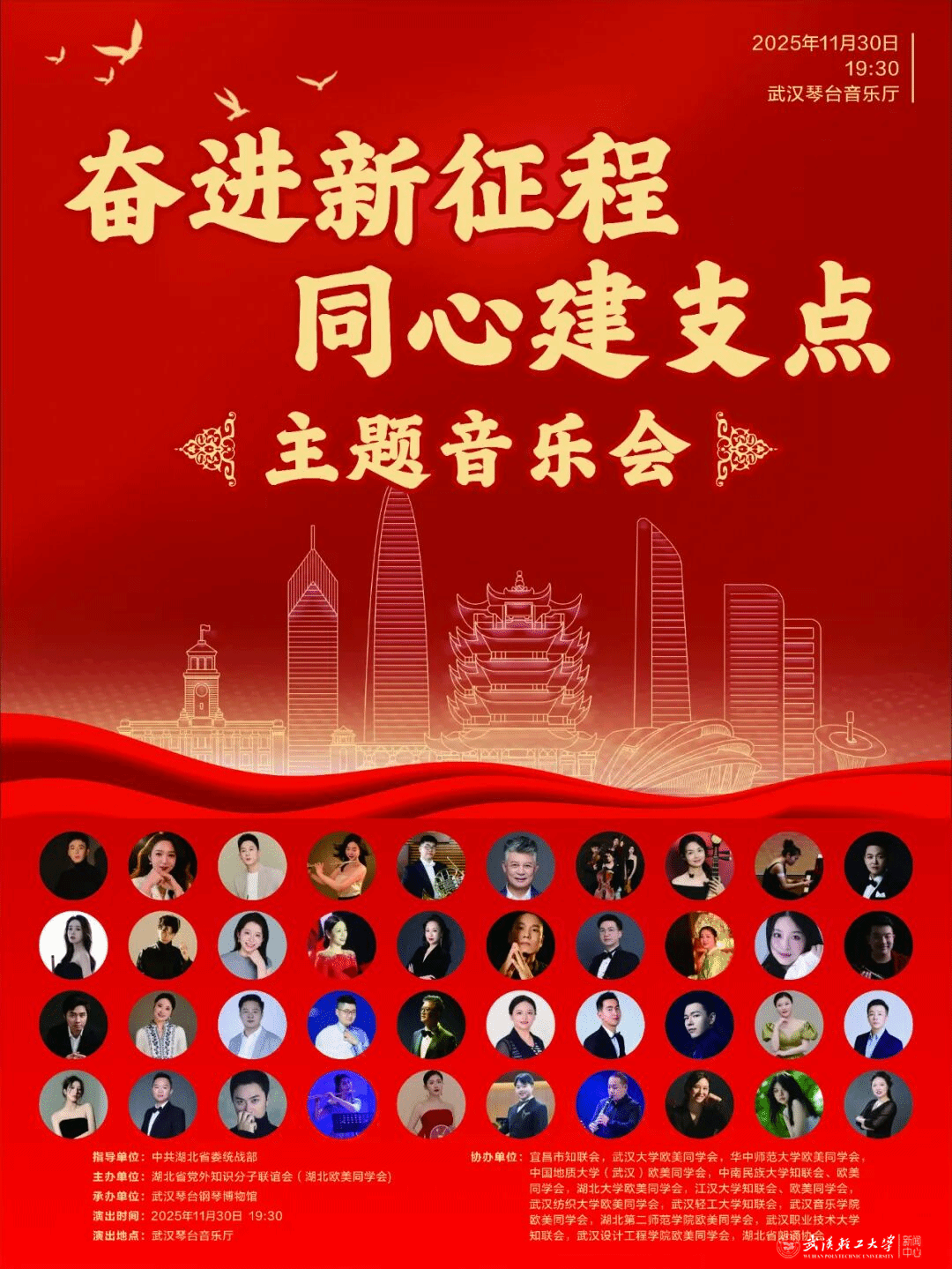 本网讯 11月30日晚,“奋进新征程 同心建支点”主题音乐会在武汉琴台音乐厅隆重举行。本次活动由湖北省委统战部指导,湖北省党外知识分子联谊会(湖北欧美同学会)主办,我校知联会作为协办单位之一参加。省委常委、统战部部长宁咏,省政协副主席、农工党省委会主委、省知联会会长杨玉华,省政协副主席、致公党省委会主委、湖北欧美同学会会长张柏青等出席活动。