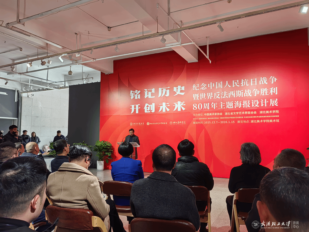 12月9日下午,“铭记历史・开创未来 —— 纪念中国人民抗日战争暨世界反法西斯战争胜利80周年“主题海报设计展在湖北美术学院美术馆正式开幕。本次展览由中国美术家协会、湖北省文学艺术界联合会、湖北美术学院联合主办,《美术》杂志社、湖北省美术家协会、中国美协平面设计艺术委员会、中关村云通计算机专业服务器系统技术创新联盟共同承办。我校文传学院彭军教师创作的作品《我们爱和平》入选并展出。