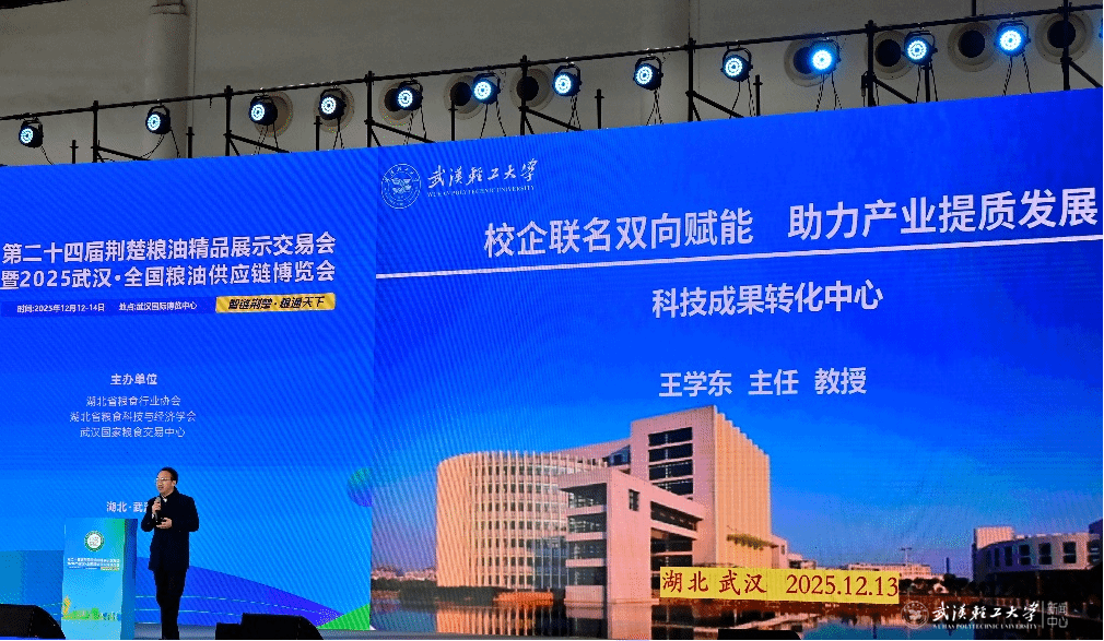 本届博览会以“智链荆楚·粮通天下”为主题,聚焦粮油供应链创新与产业升级,汇聚了全国粮油领域的专家学者与企业代表。会上,我校科技成果转化中心主任、食品学院教授王学东以“校企联名双向赋能 助力产业提质发展”为题作主题分享。他结合学校科技成果转化中心的建设实践,系统阐述了粮油食品领域的技术研发、成果转化路径,以及校企协同创新的具体模式,提出了多项契合产业实际需求的解决方案,分享内容获得了现场嘉宾与行业代表的高度认可。