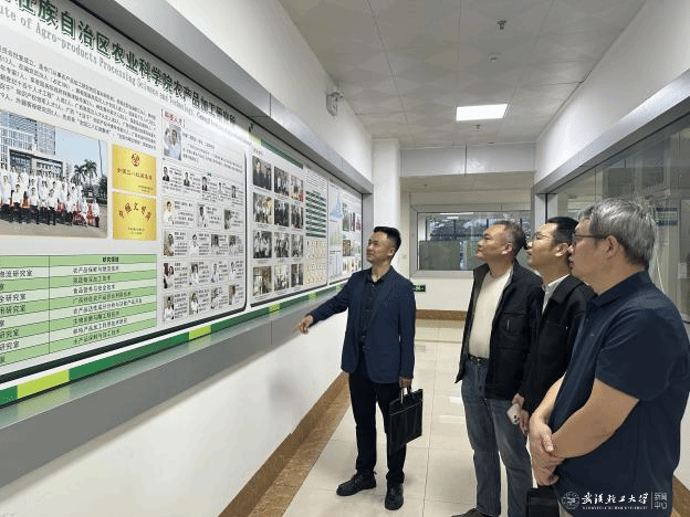 在广西省农科院,学校一行实地考察了农产品精深加工与综合利用研究中心。农科院周兴和校友详细介绍了广西在农产品加工、检测和精深利用方面的研究进展与成果。吴德明向校友们提出合作愿景,希望利用广西农科院平台,联合母校对接周边“一带一路”相关国家,开展科技合作。