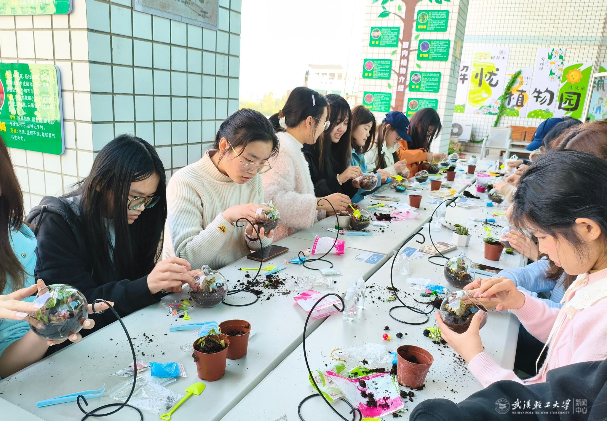 活动现场,“躬行植绿”与“微景观DIY”环节最受师生青睐,成为本次活动的亮点。师生们分组领取树苗、花种、园艺工具等材料,在园艺师与学院志愿者的专业指导下,有条不紊地开展翻土、栽种、浇水、挂牌等操作,用双手细心呵护每一抹新生的绿意,亲手为校园增添勃勃生机。栽种结束后,师生们转而投入微景观DIY创作,以苔藓、砂石、精致小摆件为素材,充分发挥创意,将春日的盎然生机浓缩进方寸玻璃瓶中。整个过程中,大家专注投入、乐在其中,解忧植物园内处处弥漫着泥土的清新芬芳与师生们的欢声笑语,洋溢着劳动的喜悦与创作的成就感。