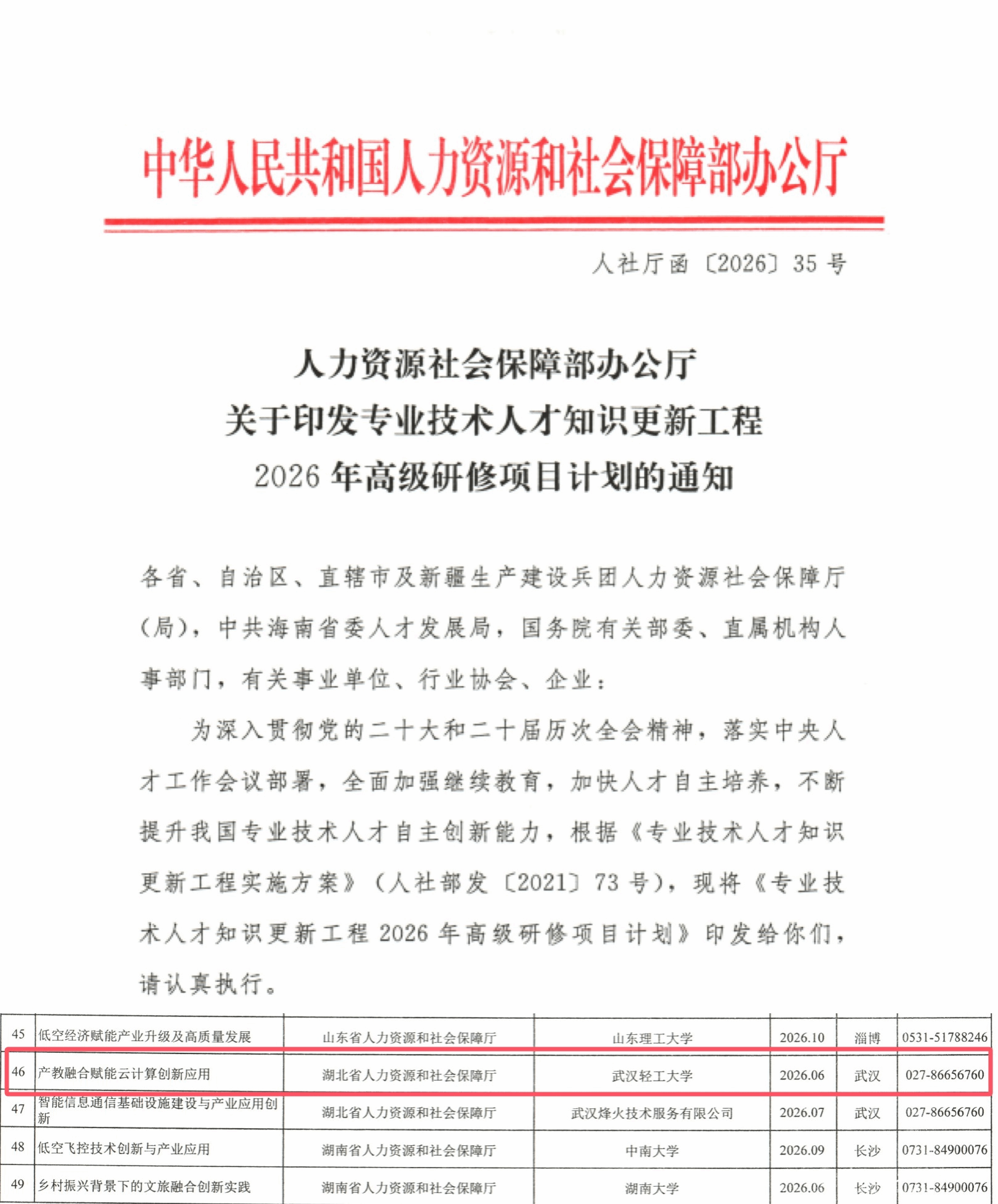 本网讯 近日,人力资源社会保障部办公厅正式印发《专业技术人才知识更新工程2026年高级研修项目计划》(人社厅函〔2026〕35 号),我校申报的“产教融合赋能云计算创新应用”高级研修项目成功获批国家级自筹经费项目。这是我校首次获得该工程高级研修项目资质,标志着学校在高层次专业技术人才培训领域实现国家级项目零的突破。