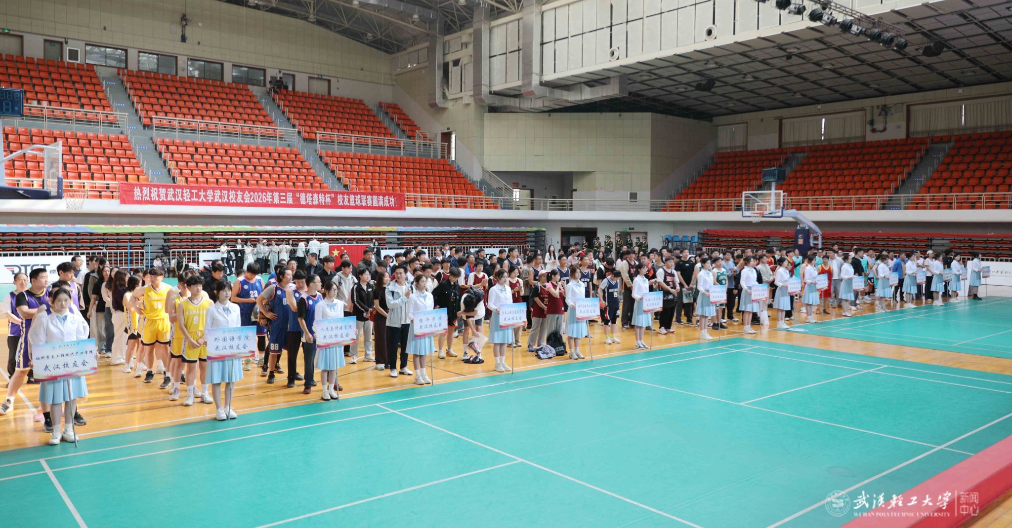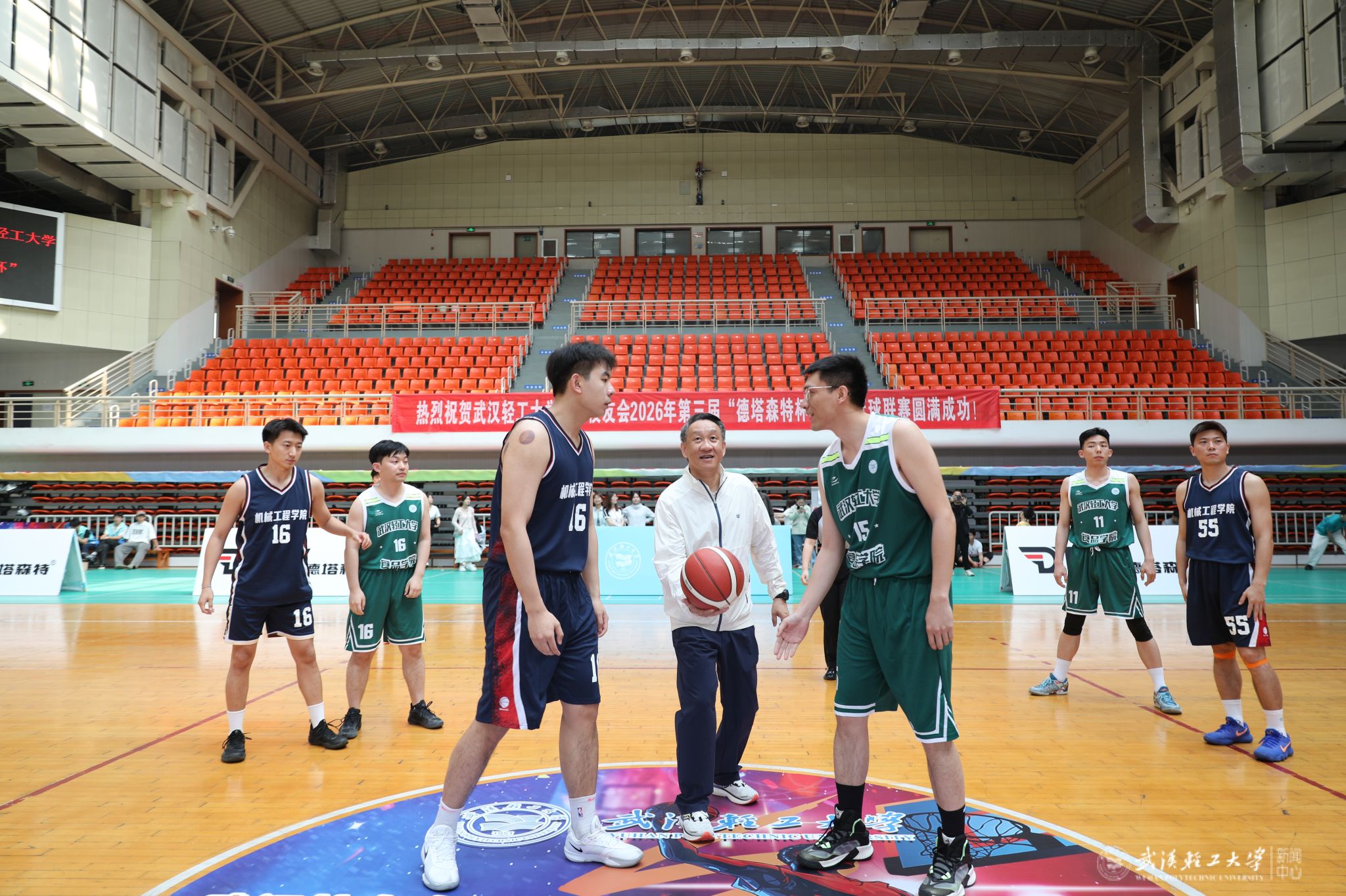 本网讯 春风送暖,热血逐梦。4月18日,学校武汉校友会2026年第三届“德塔森特杯”校友篮球联赛开赛。校党委书记严冀钢,校党委常委、副校长曾山,武汉校友会会长王升洪、秘书长滕红华、常务副会长王志凌出席,16支学院校友代表队,学校武汉校友会理事会、相关职能部门及学院负责人共200余人参加活动。